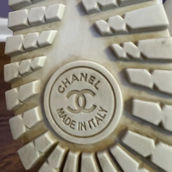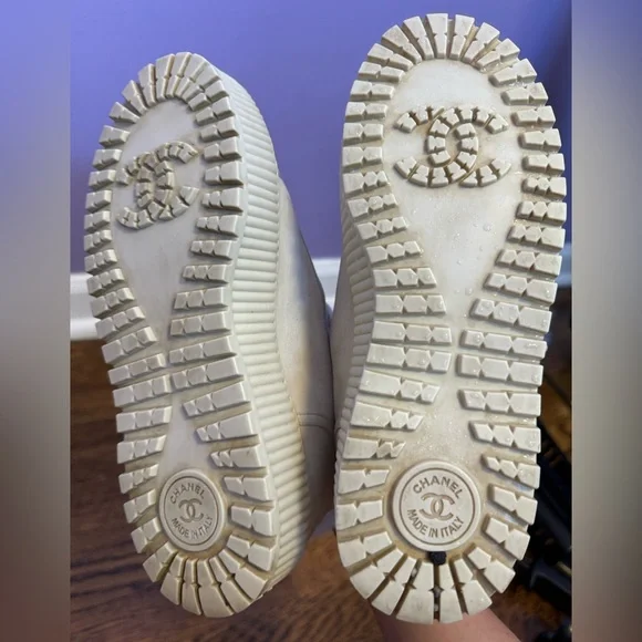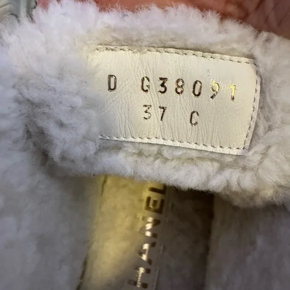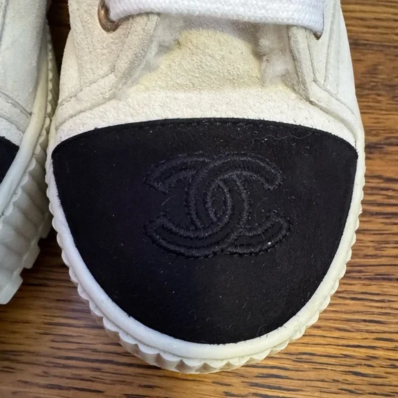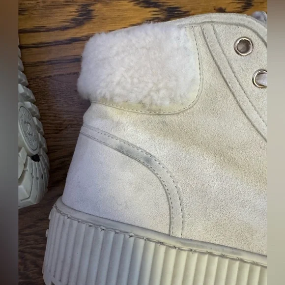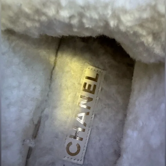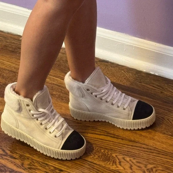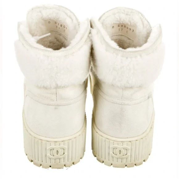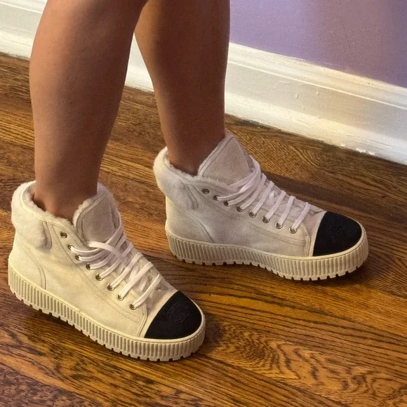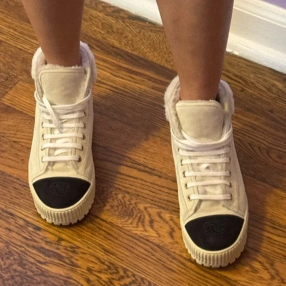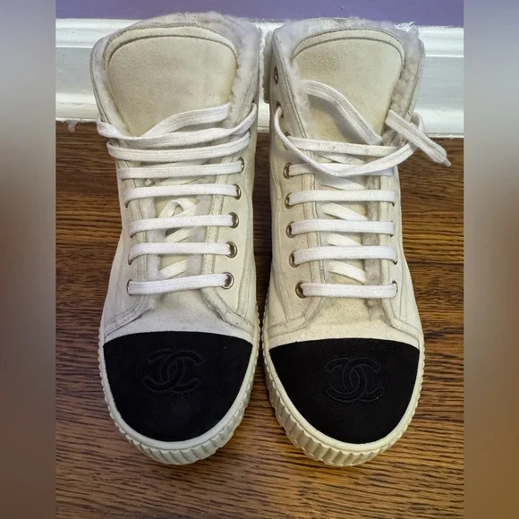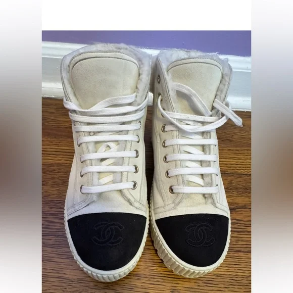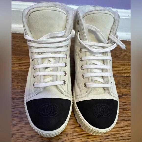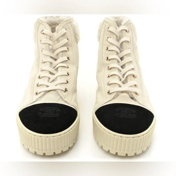 Chanel KID white shearling suede snow sneakers High TOP This is an authentic pair of Chanel Kid Suede Shearling Sheepskin Lace Up Boots Size 37 in Ivory white , White, and Black. These ultra stylish pair of sneakers are crafted of white suede with white shearling sheepskin and a black cap toe. They feature Chanel CC logo, gold eyelets, and white shoe laces.From the 2021 Collection by Virginie ViardSize 37 IT Fit 6.5 US or 6 if you like looser FIT Condition is very good : minor discoloration creaseInsole 9.5”Shaft -5.5”Heel -1.5”Very warm and comfortable No dust bags ,noBox Please ask if any question